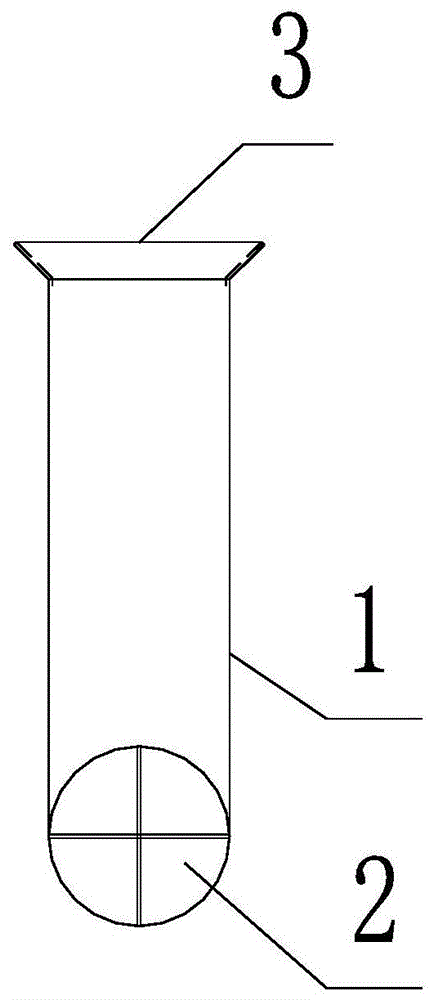 沉淀池套筒閥通過連接的管道和沉淀池組成連通器,利用靜壓差原理,通過調(diào)節(jié)套筒閥的出水高度,排泥并調(diào)節(jié)排泥量。套筒閥的本體1上部通常有一個(gè)一字橫梁、底部十字支撐2,一字橫梁的頂部還設(shè)置有傘帽3,如圖1所示。傘帽和十字支撐的存在容易造成絮狀物的纏繞導(dǎo)致堵塞,這樣的結(jié)構(gòu)設(shè)計(jì)容易造成套筒閥出水量減小,使污泥回流量、回流比降低。本實(shí)用新型正是基于此,提出了一種新型沉淀池套筒閥,旨在克服傳統(tǒng)套筒閥的上述缺陷,提高污泥回流量。